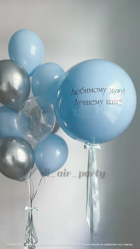 В набор входит: 1 шт. - фонтан из 10 шариков ( 2 шт. белых пастель, 4 шт. голубых пастель, 3 шт. серебро хром, 1 шт. прозрачный с конфетти ) 1 шт. - шар гигант (55 см), с надписью