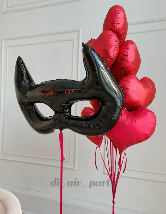 В набор входит: 1 шт. - фонтан из 10 шаров сердечек (45 см) 1 шт. - фигура маска (107 см) 2 шт. - грузик